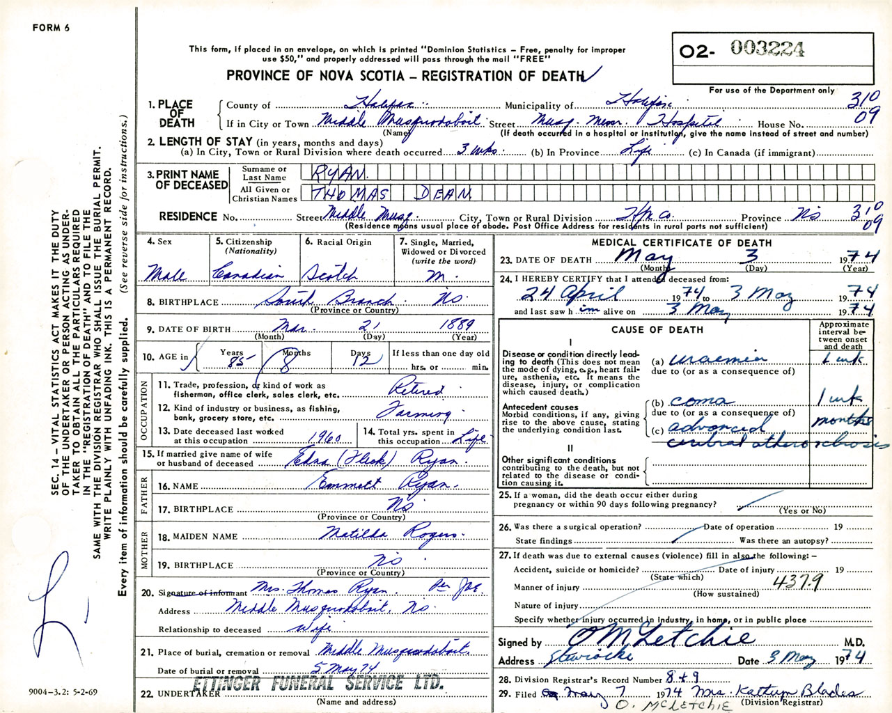 Male Death Registration: Year: 1974 number: 3224