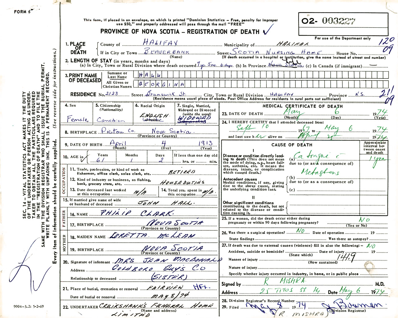 Female Death Registration: Year: 1974 number: 3227