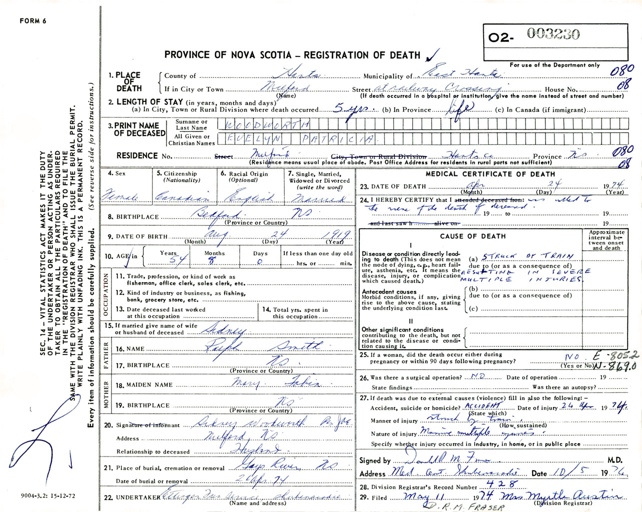 Female Death Registration: Year: 1974 number: 3230