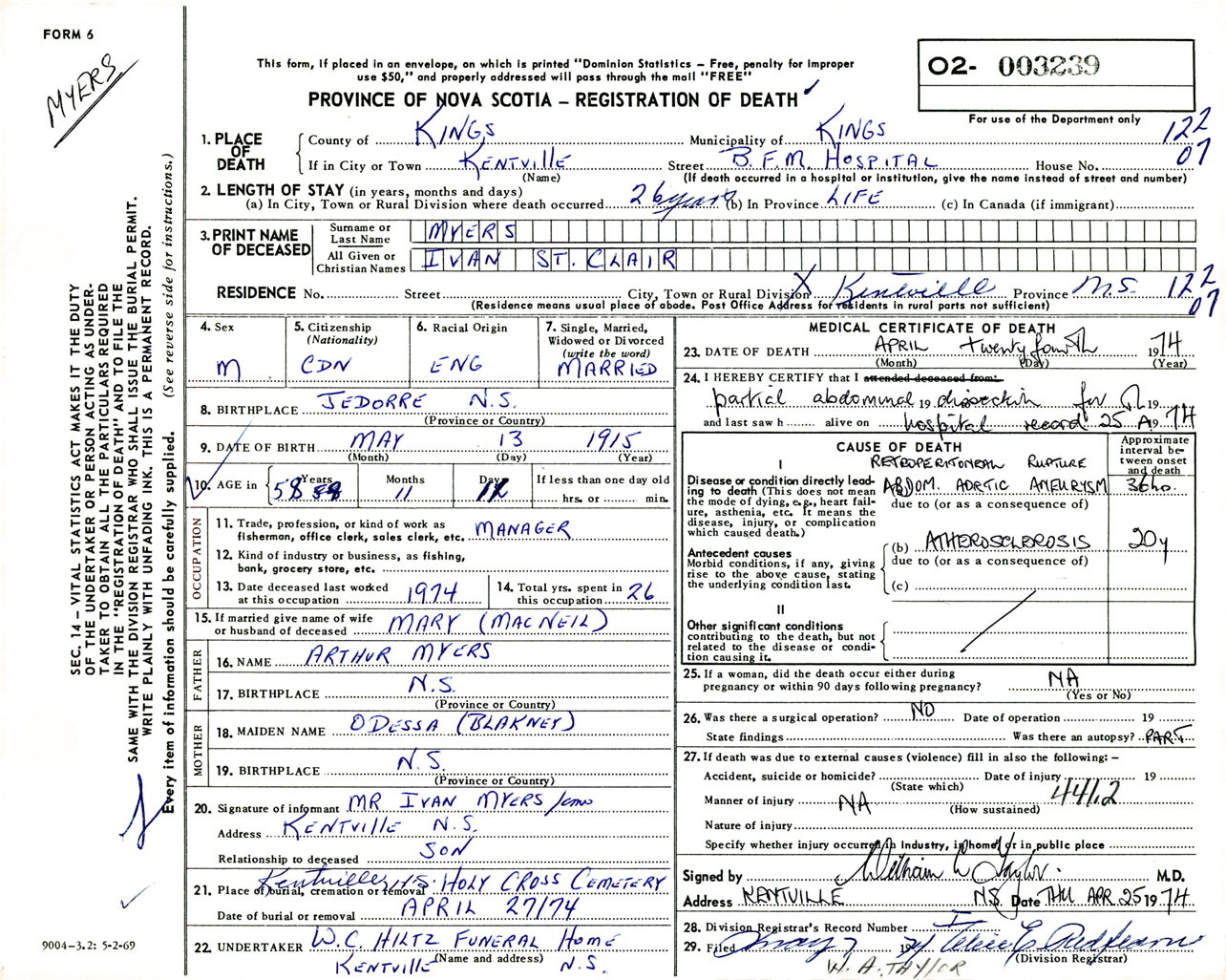 Male Death Registration: Year: 1974 number: 3239