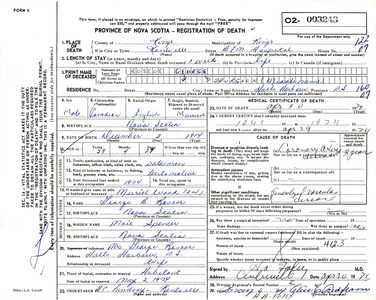 Male Death Registration: Year: 1974 number: 3243