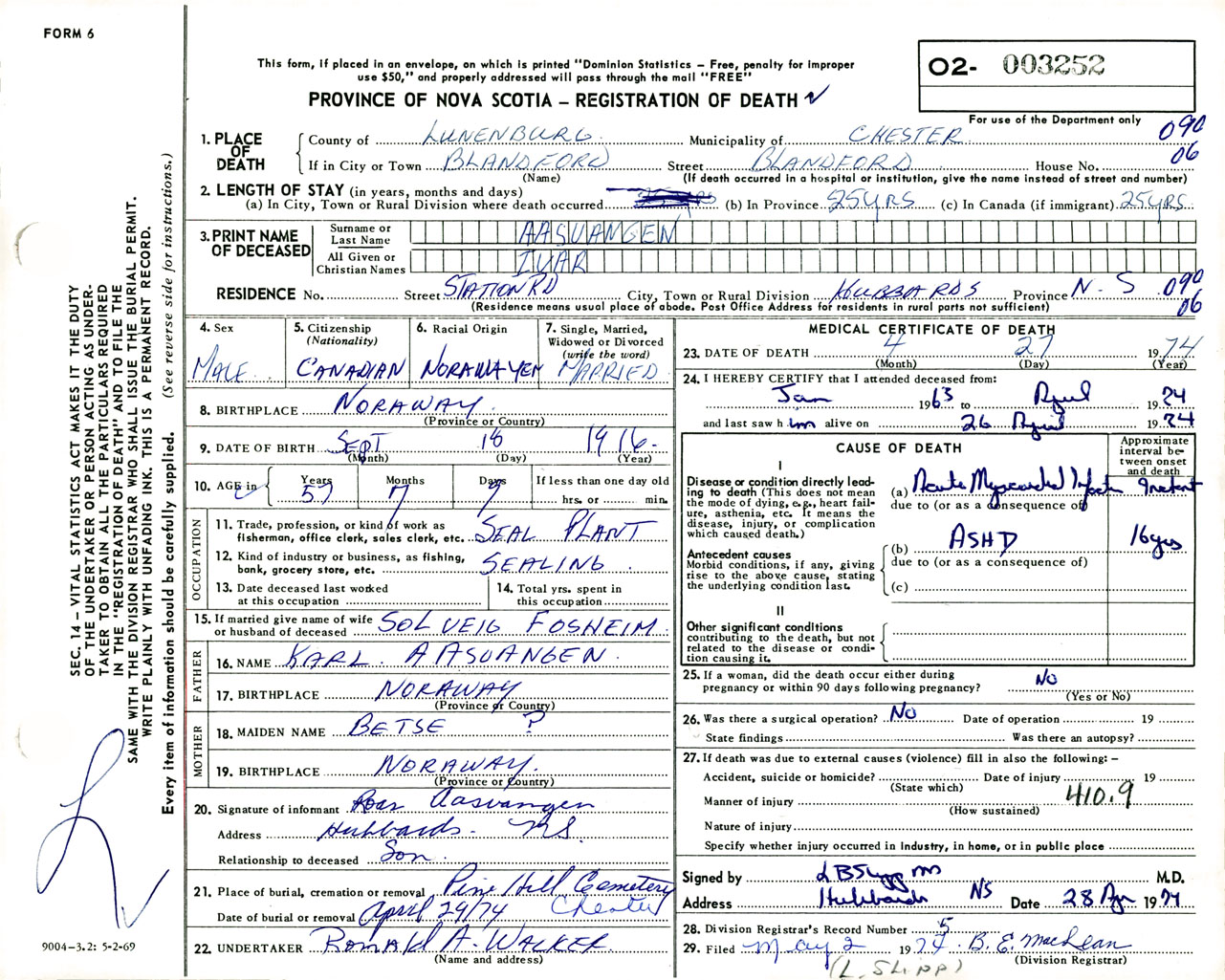 Male Death Registration: Year: 1974 number: 3252