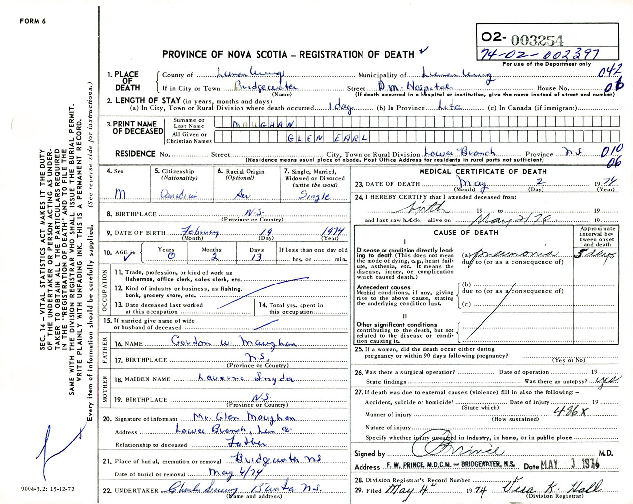 Male Death Registration: Year: 1974 number: 3254