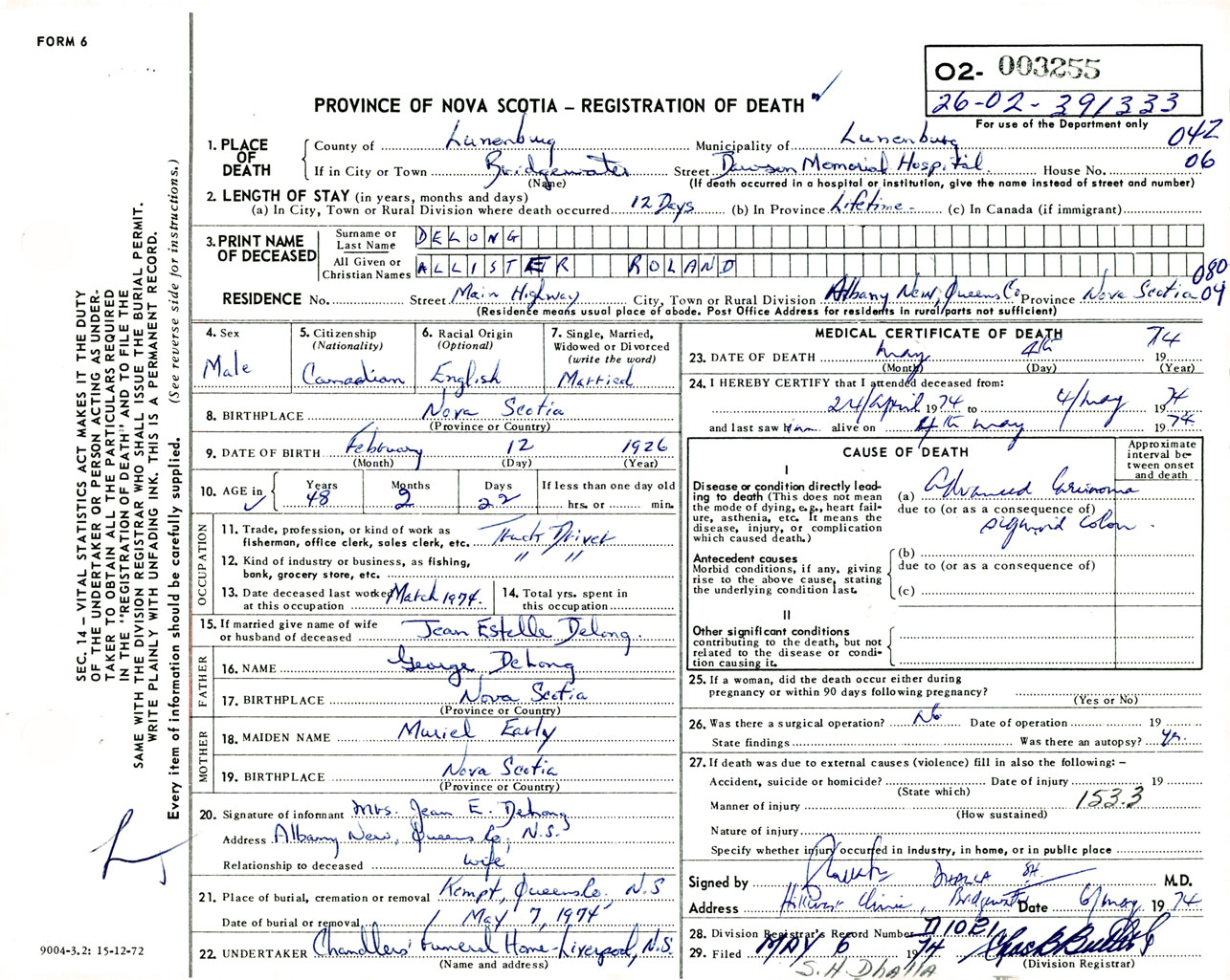 Male Death Registration: Year: 1974 number: 3255