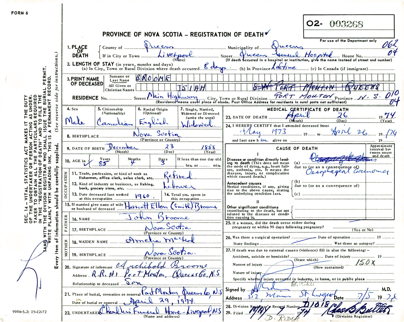 Male Death Registration: Year: 1974 number: 3268