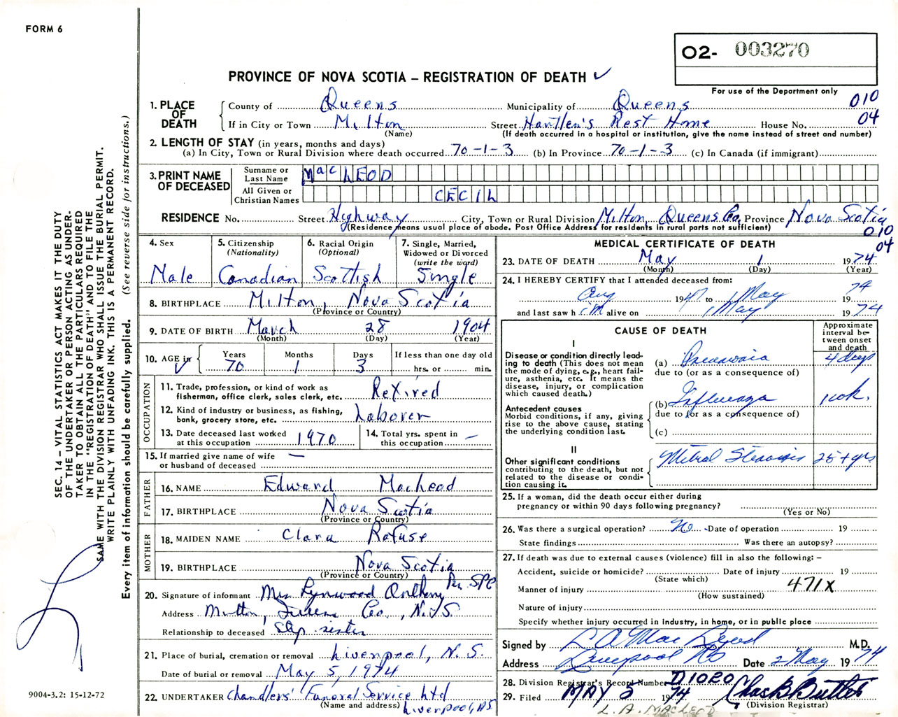 Male Death Registration: Year: 1974 number: 3270