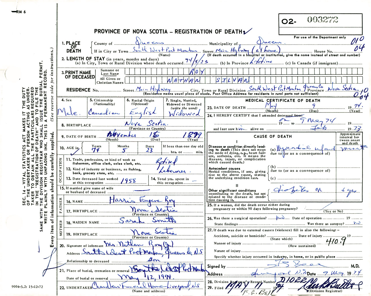 Male Death Registration: Year: 1974 number: 3272