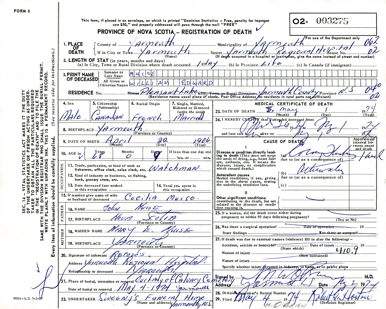 Male Death Registration: Year: 1974 number: 3275