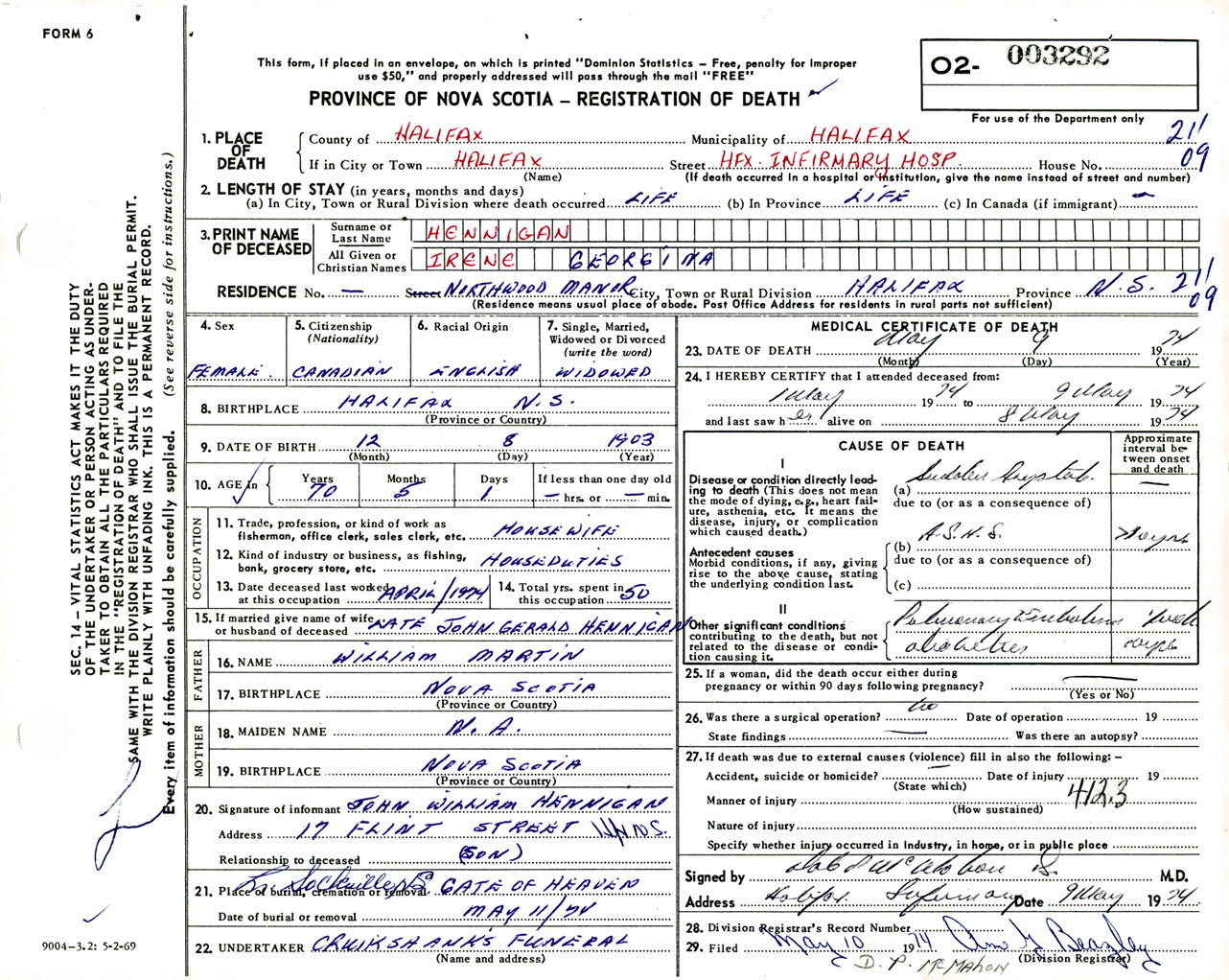 Female Death Registration: Year: 1974 number: 3292