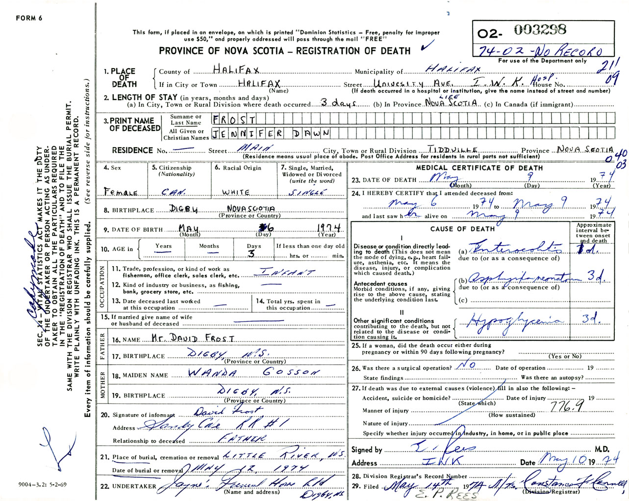Female Death Registration: Year: 1974 number: 3298
