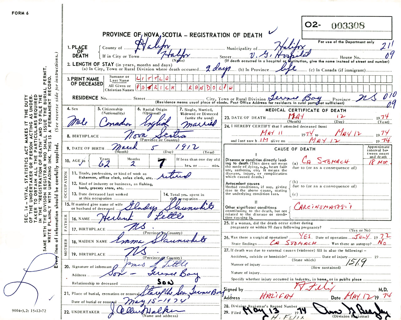 Male Death Registration: Year: 1974 number: 3308