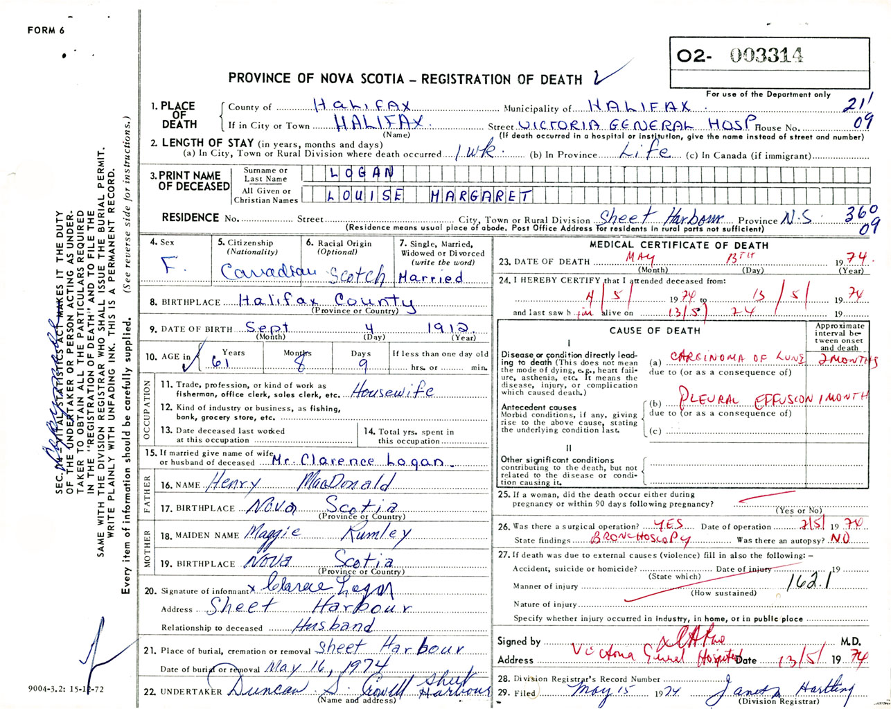 Female Death Registration: Year: 1974 number: 3314