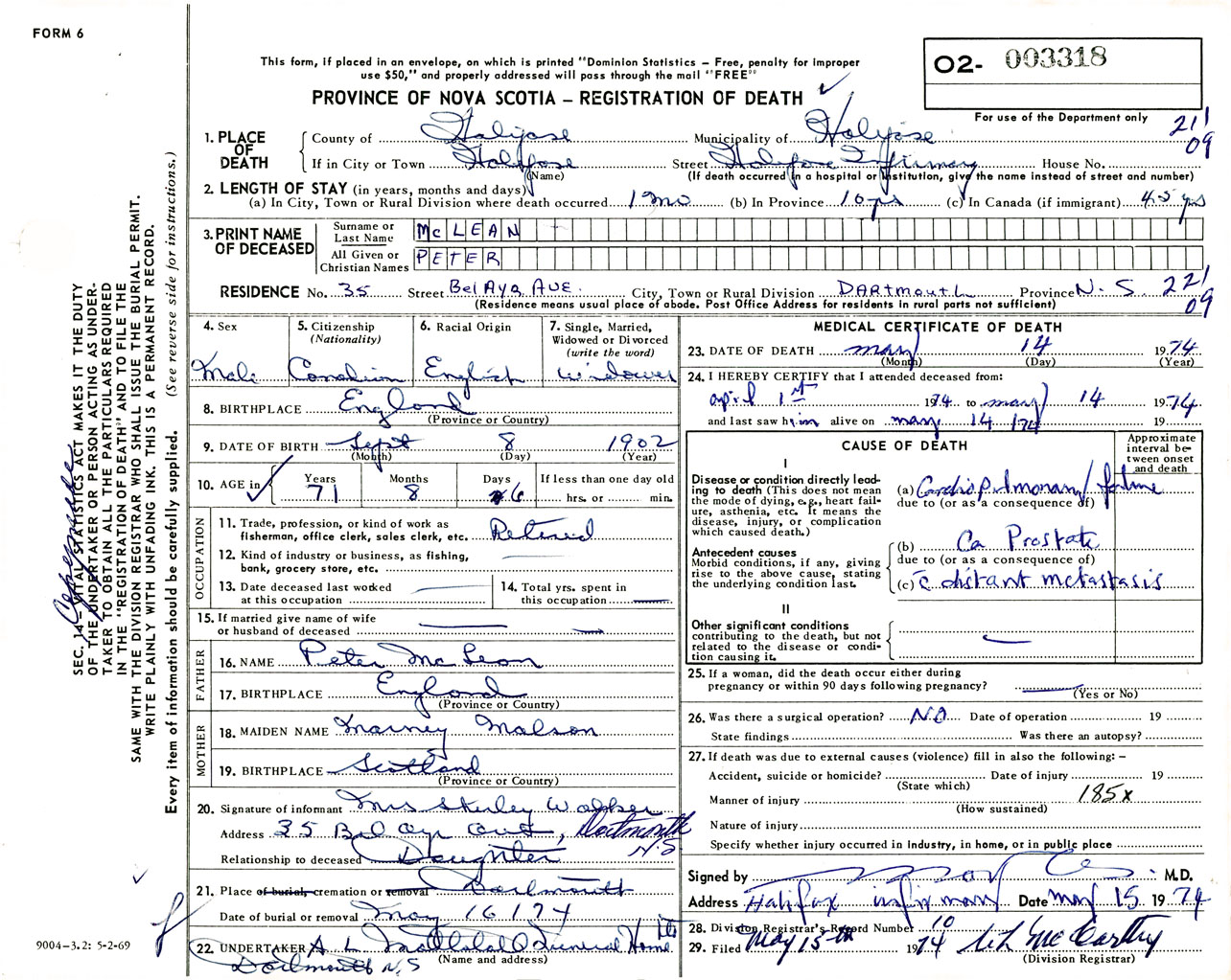 Male Death Registration: Year: 1974 number: 3318