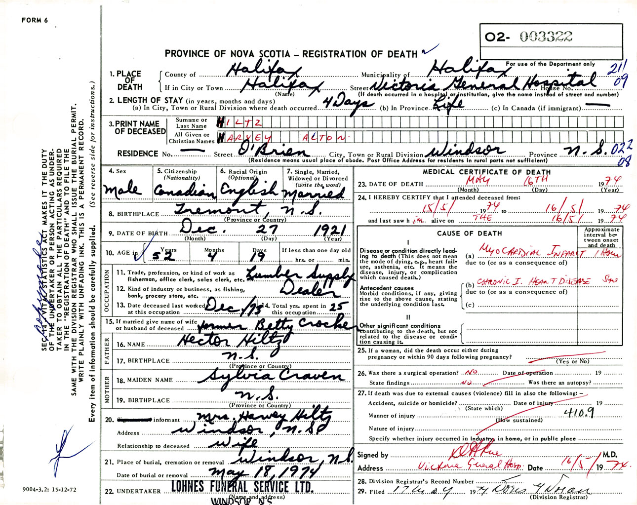 Male Death Registration: Year: 1974 number: 3322