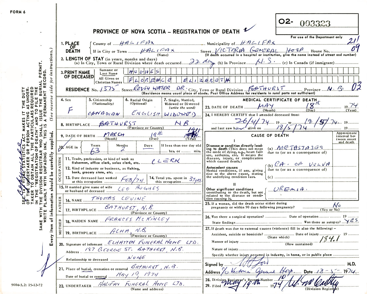 Female Death Registration: Year: 1974 number: 3323