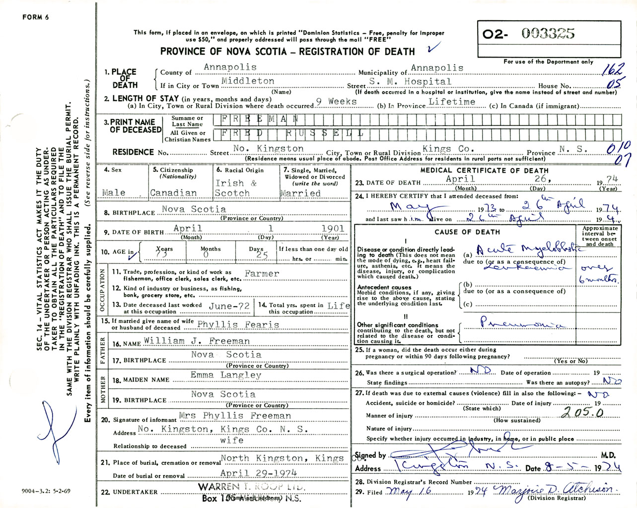 Male Death Registration: Year: 1974 number: 3325