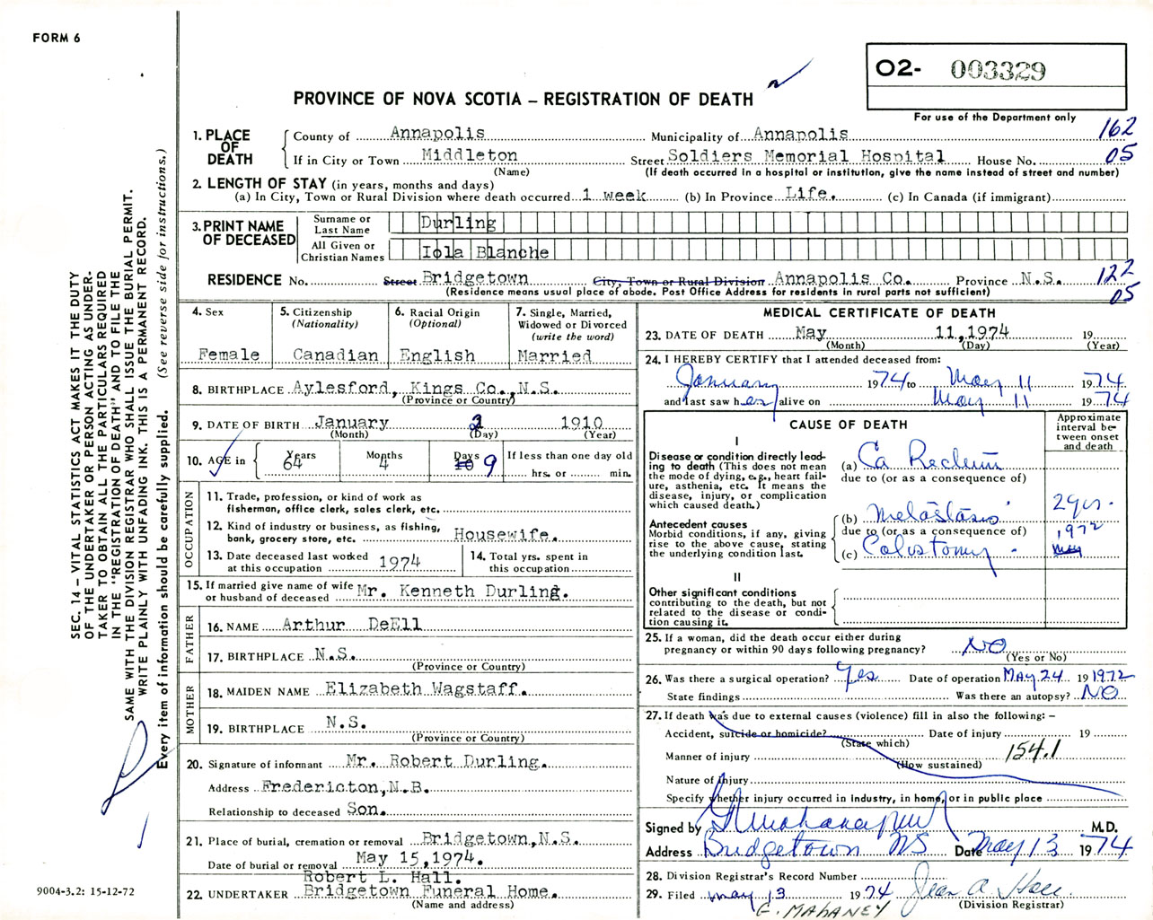 Female Death Registration: Year: 1974 number: 3329
