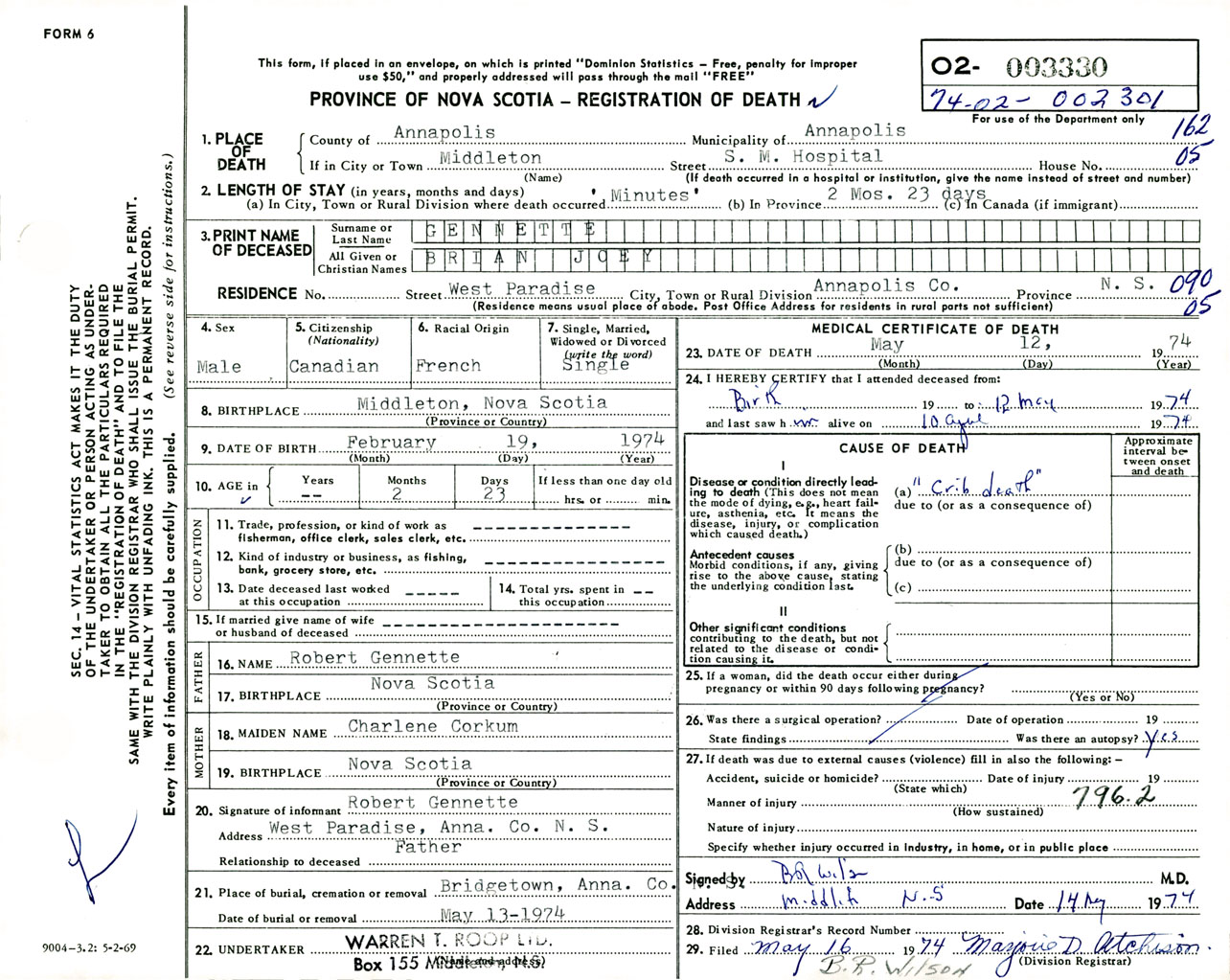 Male Death Registration: Year: 1974 number: 3330