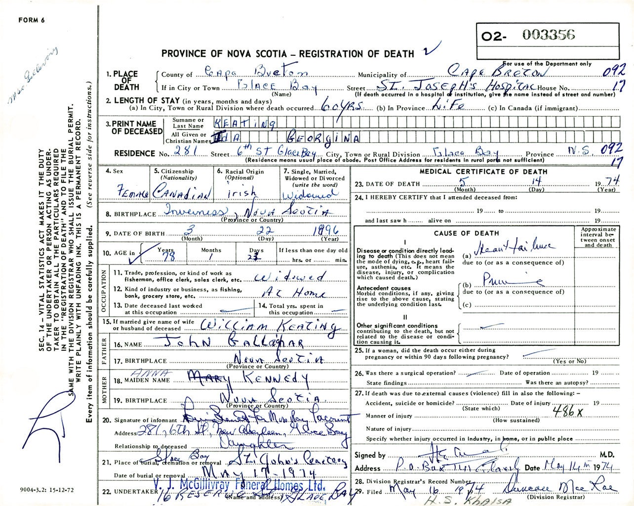 Female Death Registration: Year: 1974 number: 3356