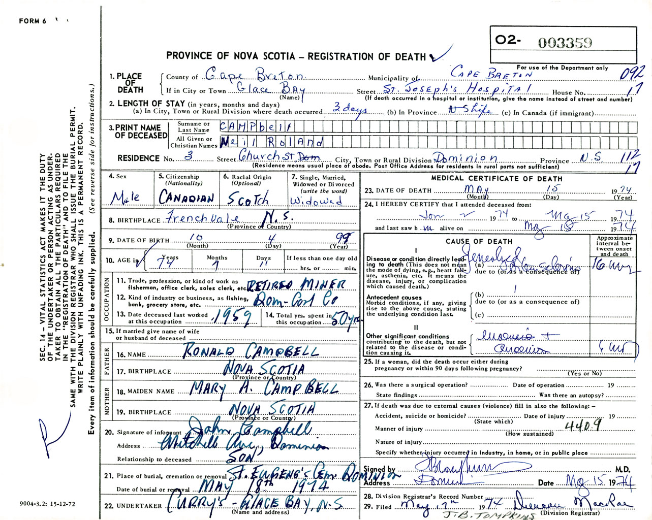 Male Death Registration: Year: 1974 number: 3359