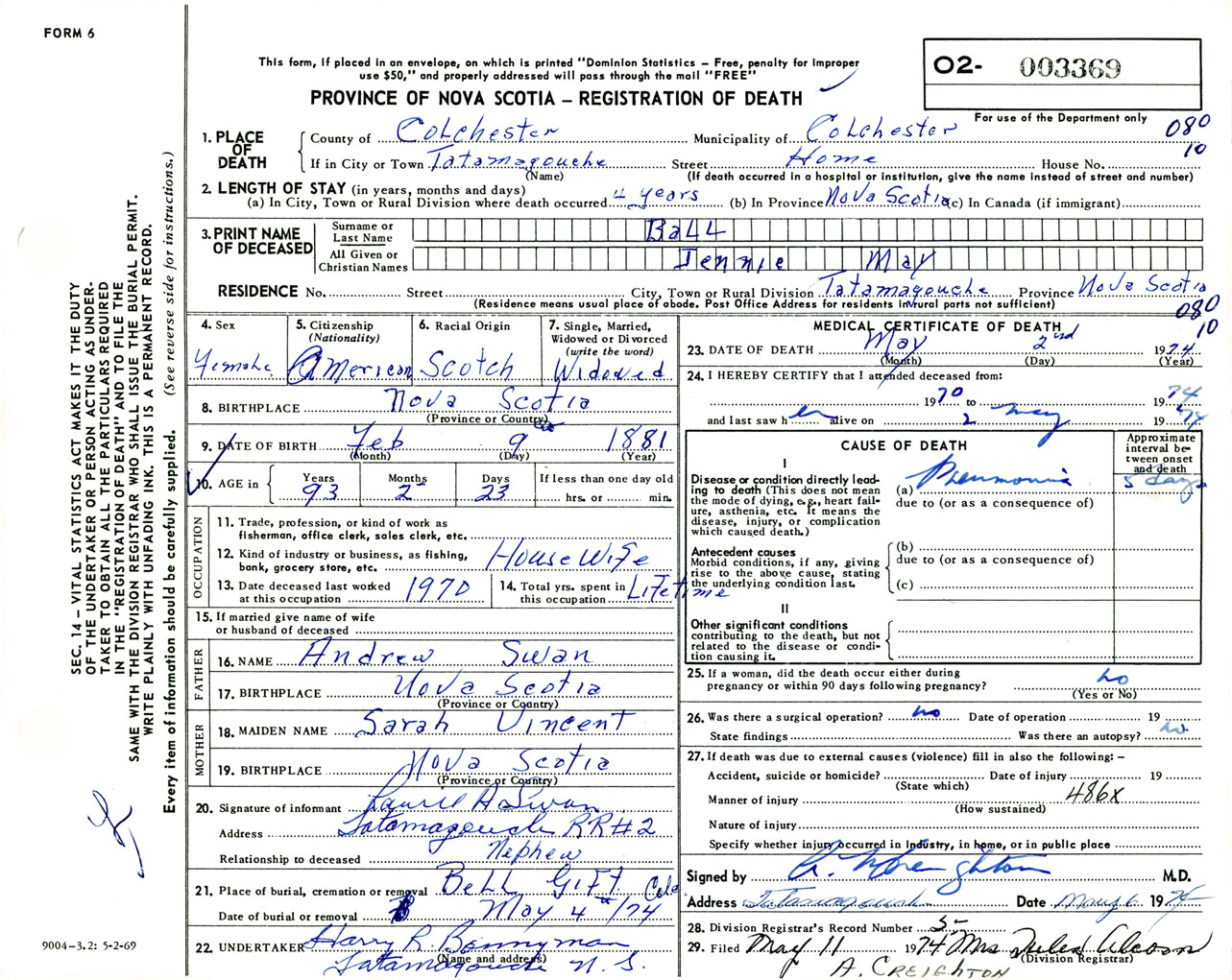 Female Death Registration: Year: 1974 number: 3369