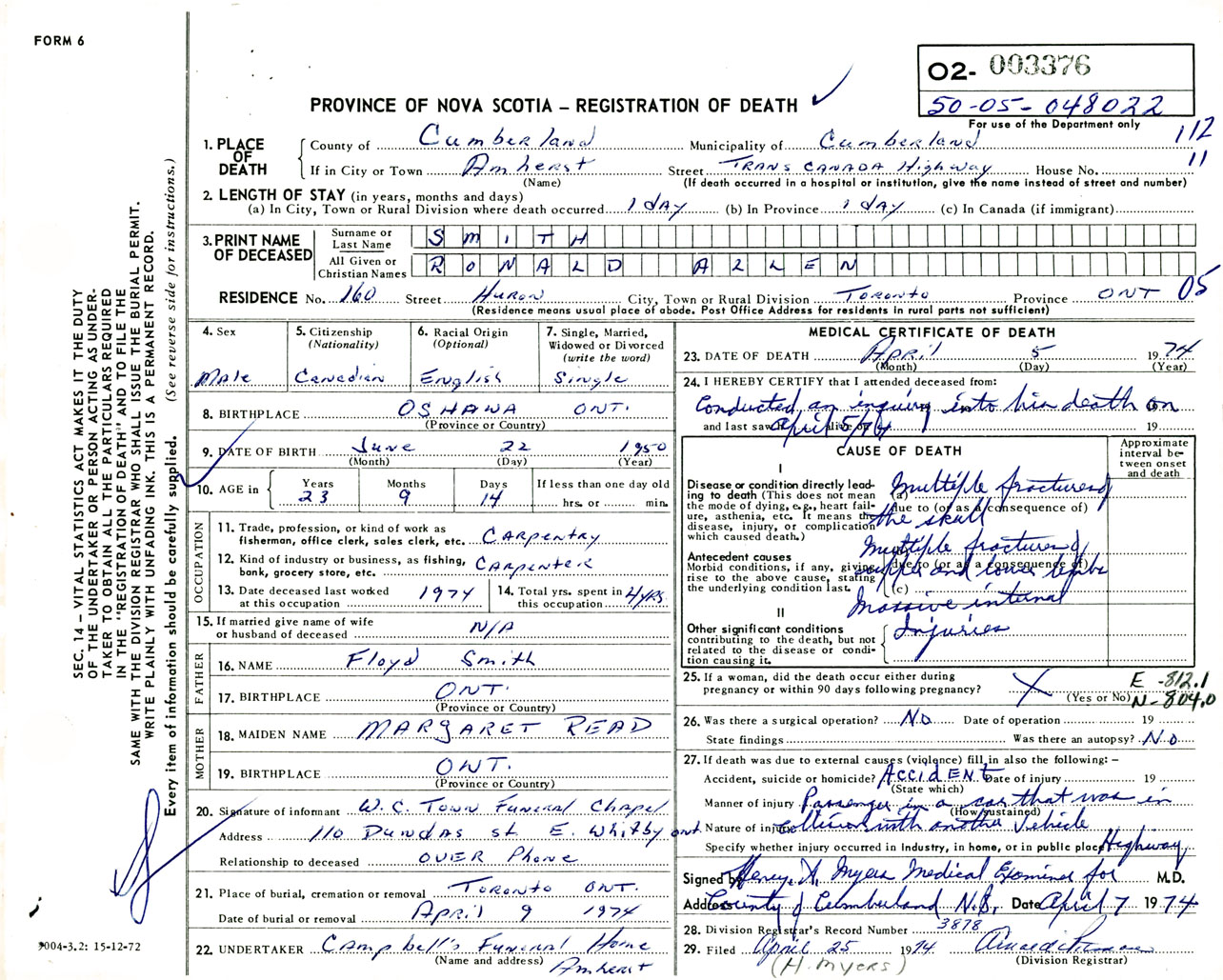 Male Death Registration: Year: 1974 number: 3376