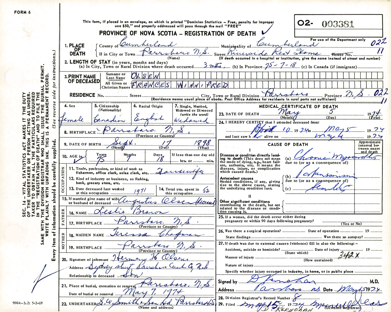 Female Death Registration: Year: 1974 number: 3381