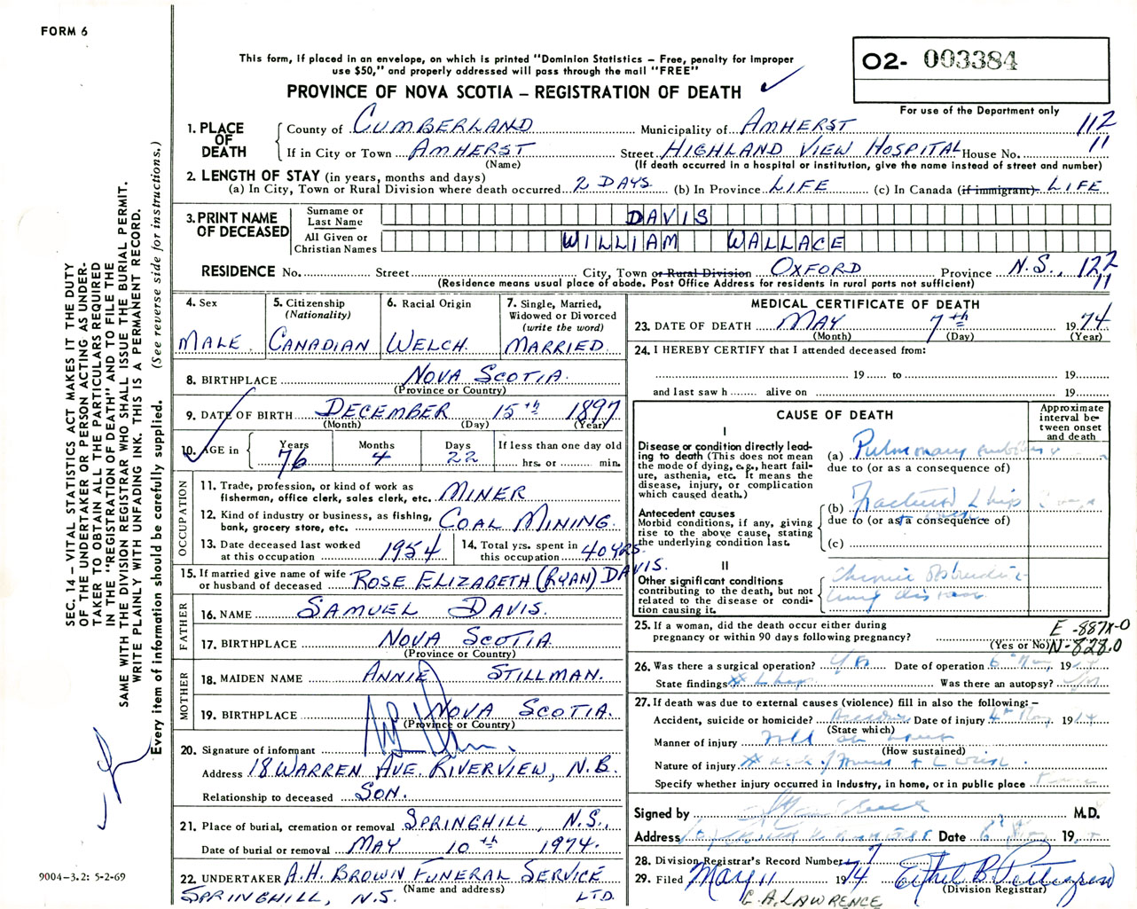 Male Death Registration: Year: 1974 number: 3384
