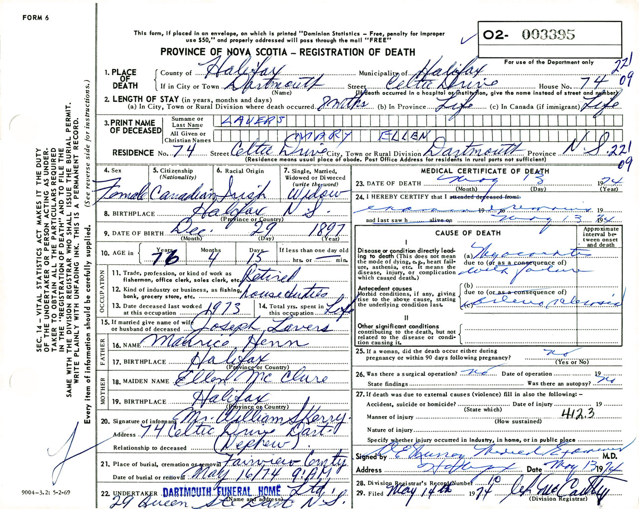 Female Death Registration: Year: 1974 number: 3395