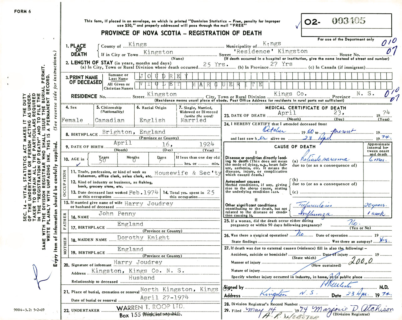 Female Death Registration: Year: 1974 number: 3405