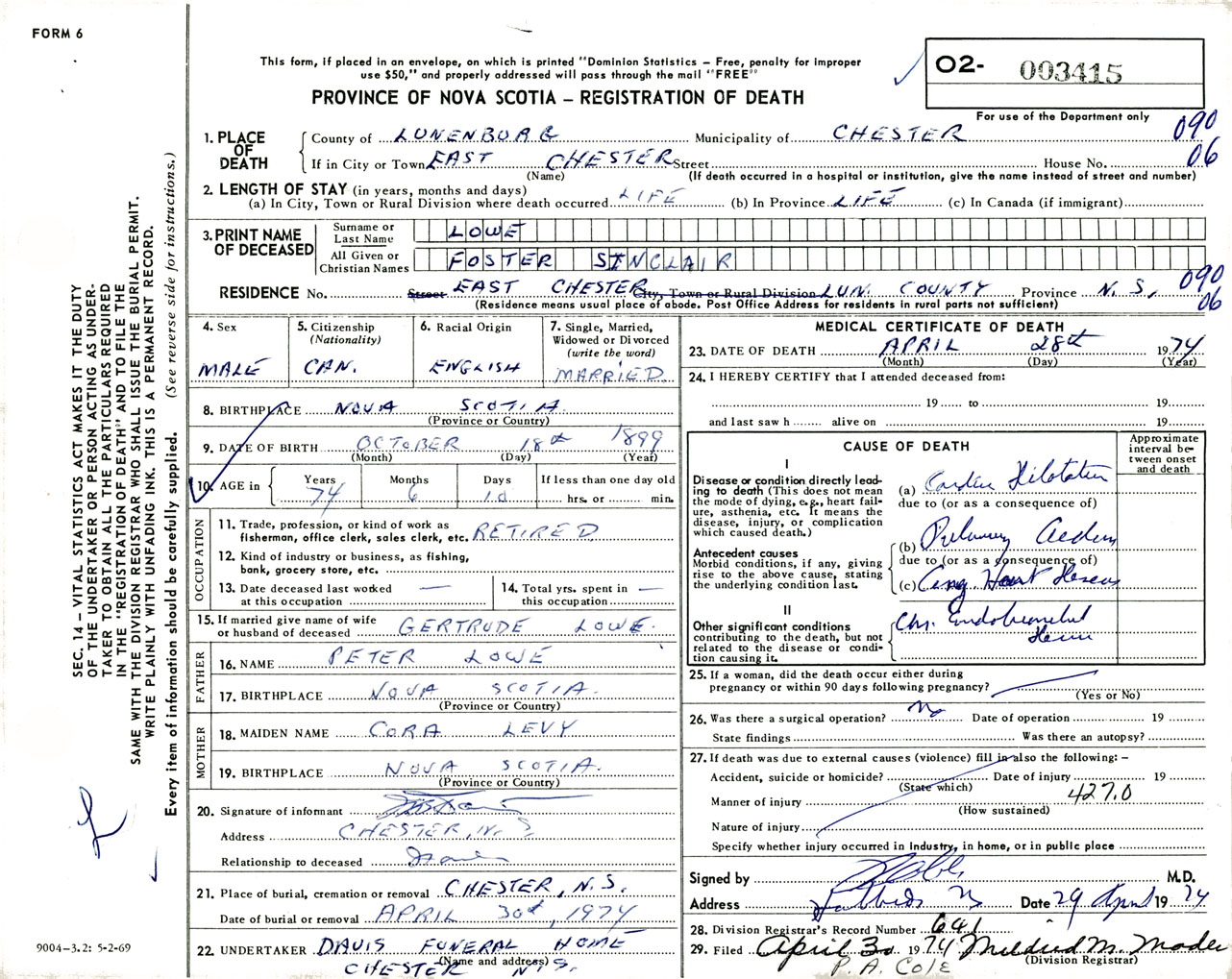 Male Death Registration: Year: 1974 number: 3415
