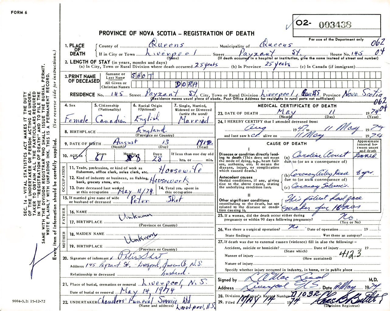 Female Death Registration: Year: 1974 number: 3438