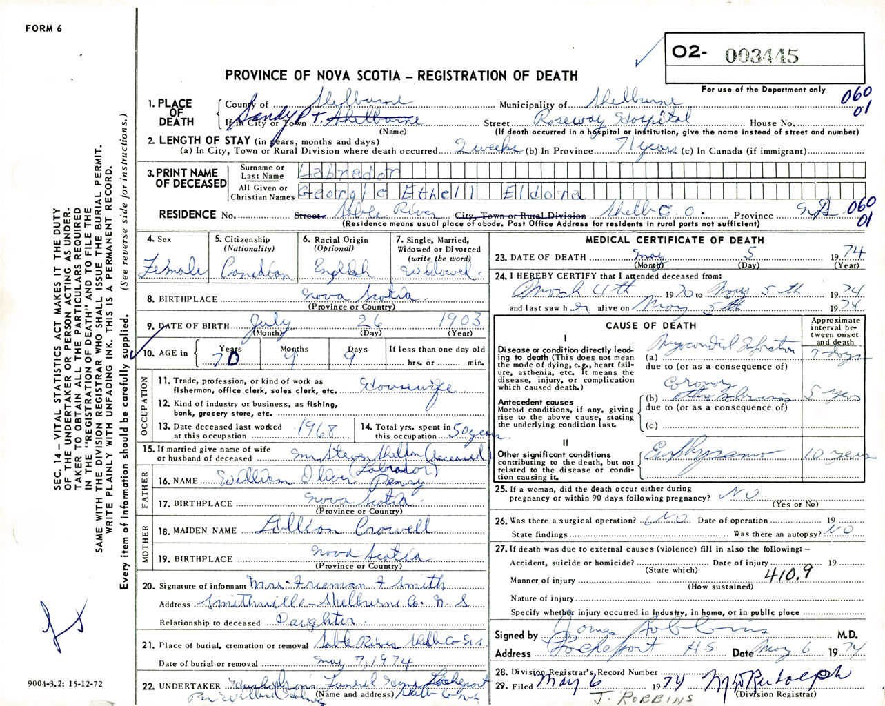 Female Death Registration: Year: 1974 number: 3445