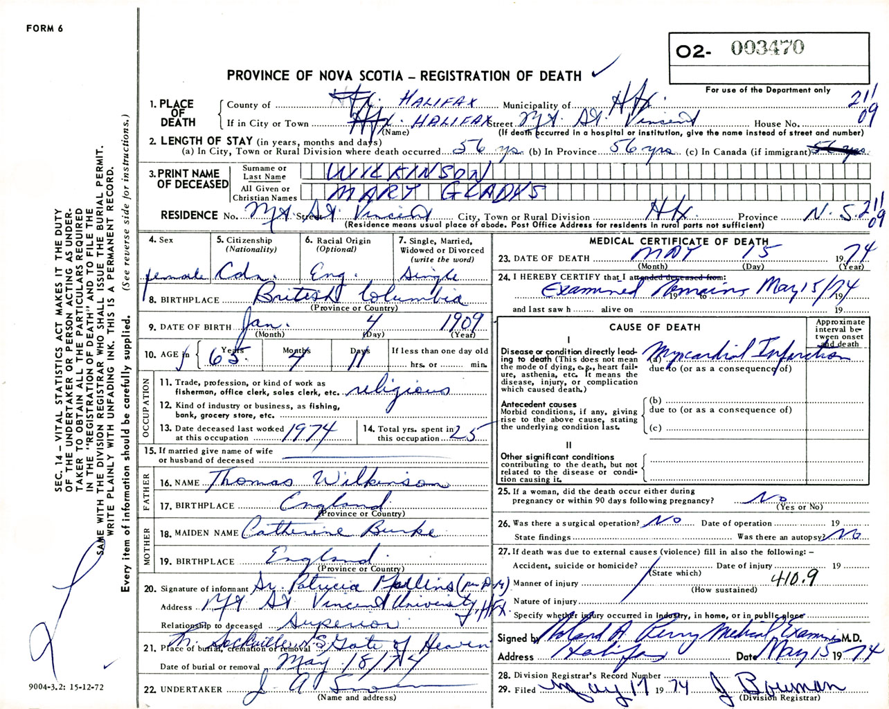 Female Death Registration: Year: 1974 number: 3470