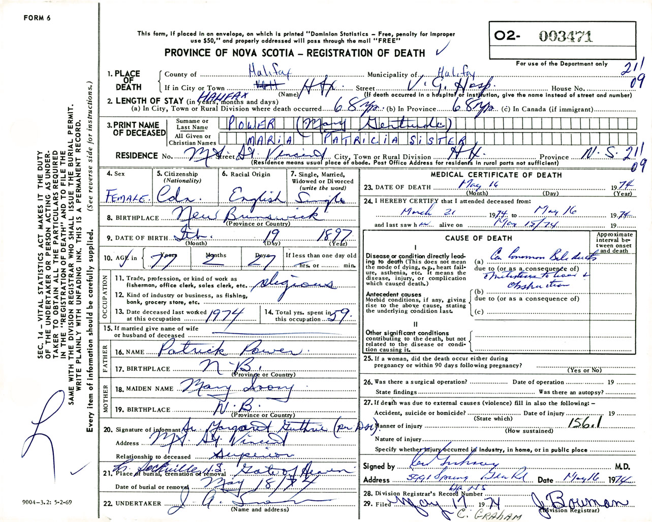 Female Death Registration: Year: 1974 number: 3471