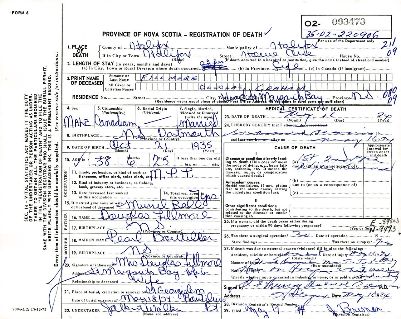 Male Death Registration: Year: 1974 number: 3473