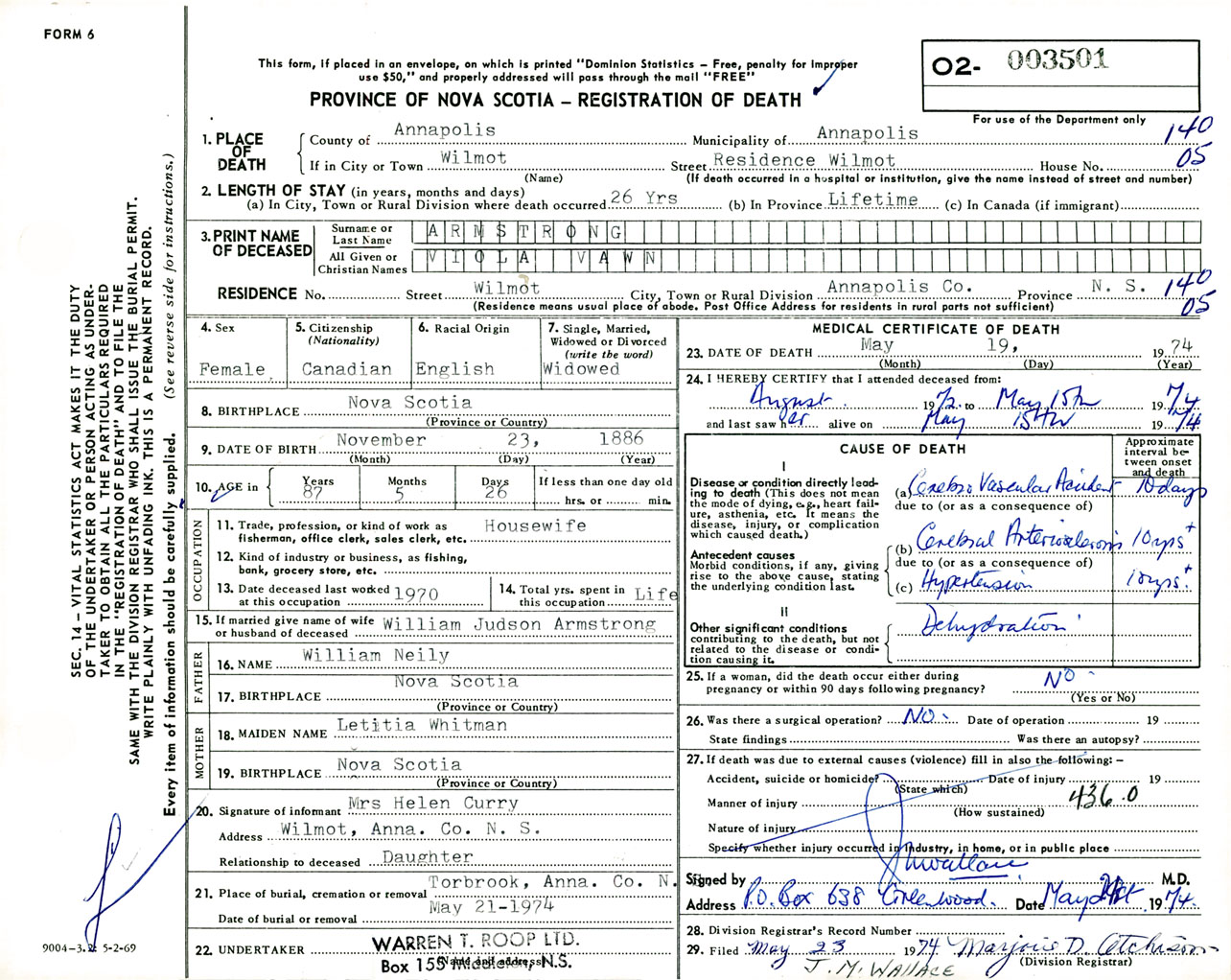Female Death Registration: Year: 1974 number: 3501