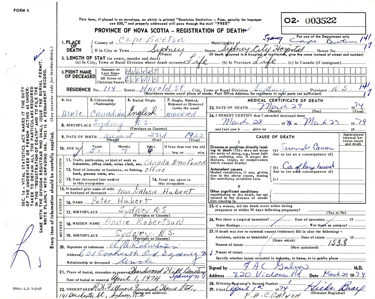 Male Death Registration: Year: 1974 number: 3522