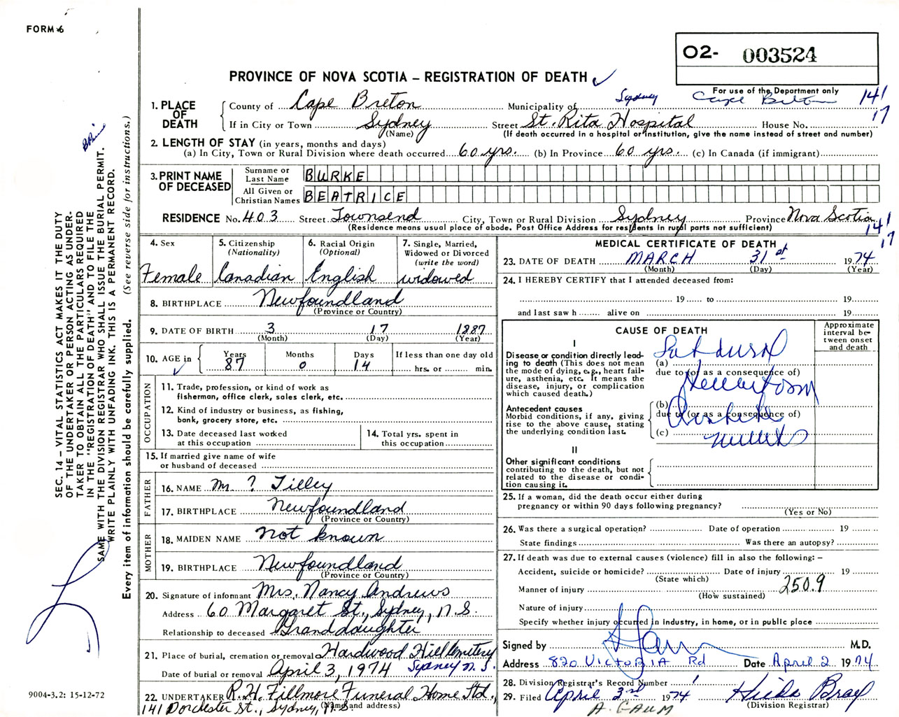 Female Death Registration: Year: 1974 number: 3524