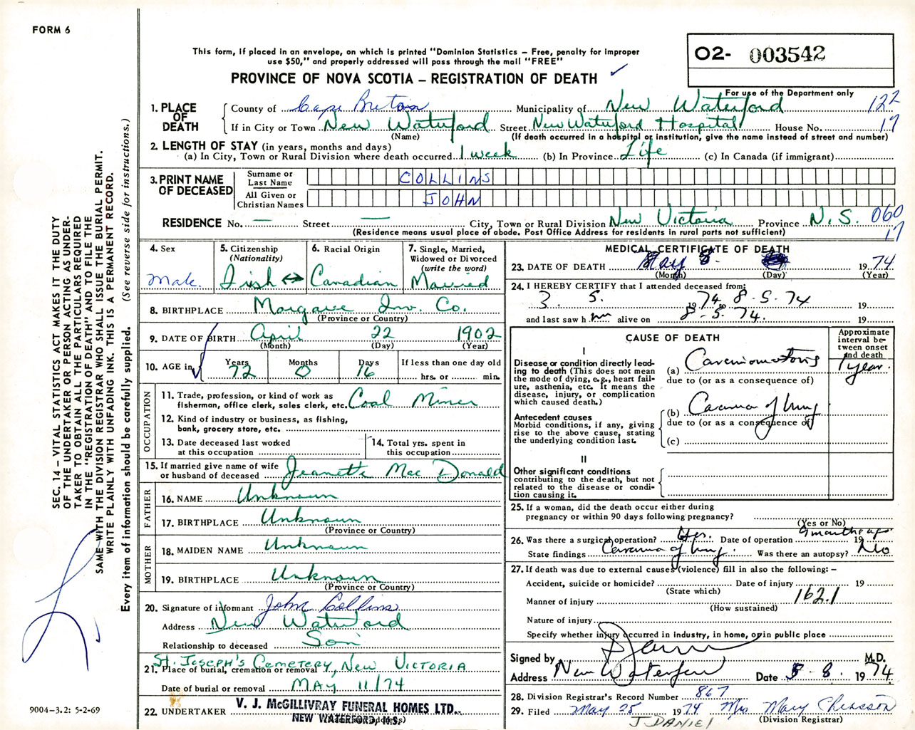Male Death Registration: Year: 1974 number: 3542