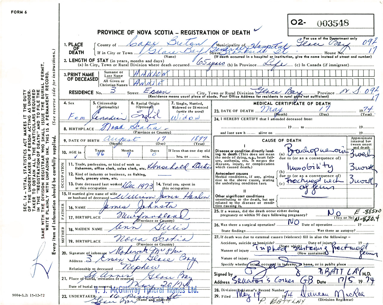 Female Death Registration: Year: 1974 number: 3548