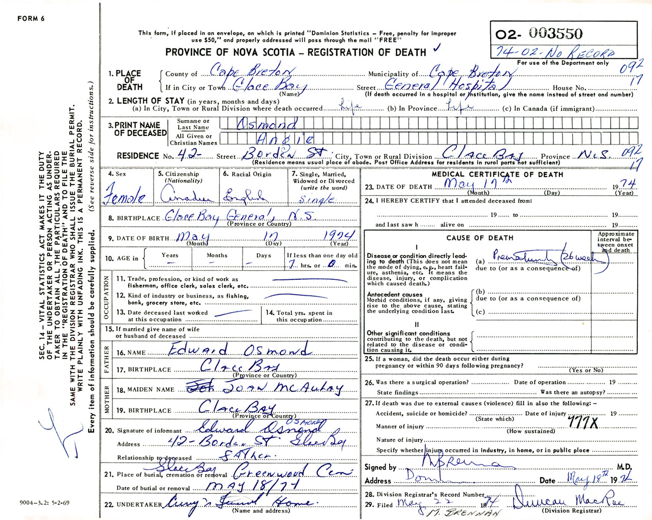Female Death Registration: Year: 1974 number: 3550