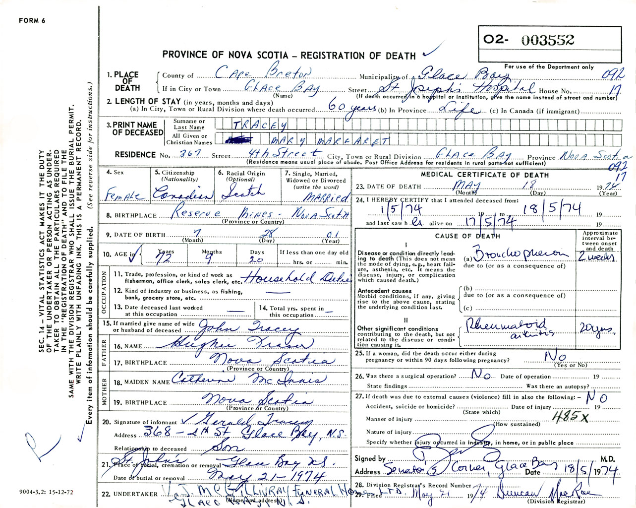 Female Death Registration: Year: 1974 number: 3552