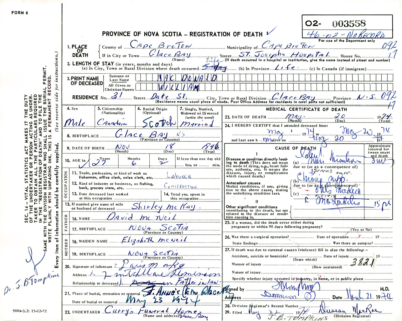 Male Death Registration: Year: 1974 number: 3558