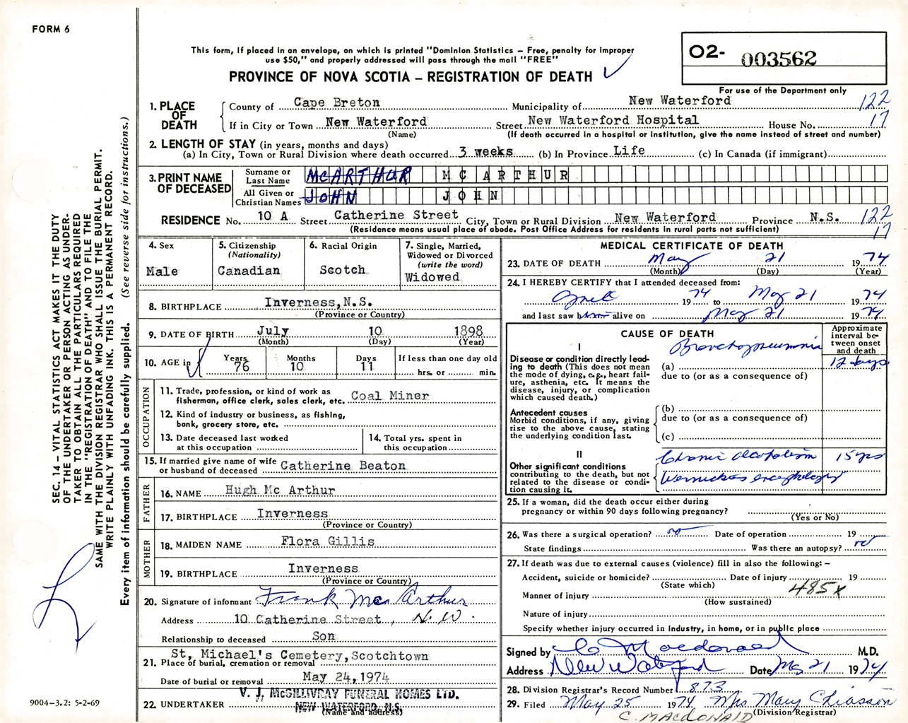 Male Death Registration: Year: 1974 number: 3562