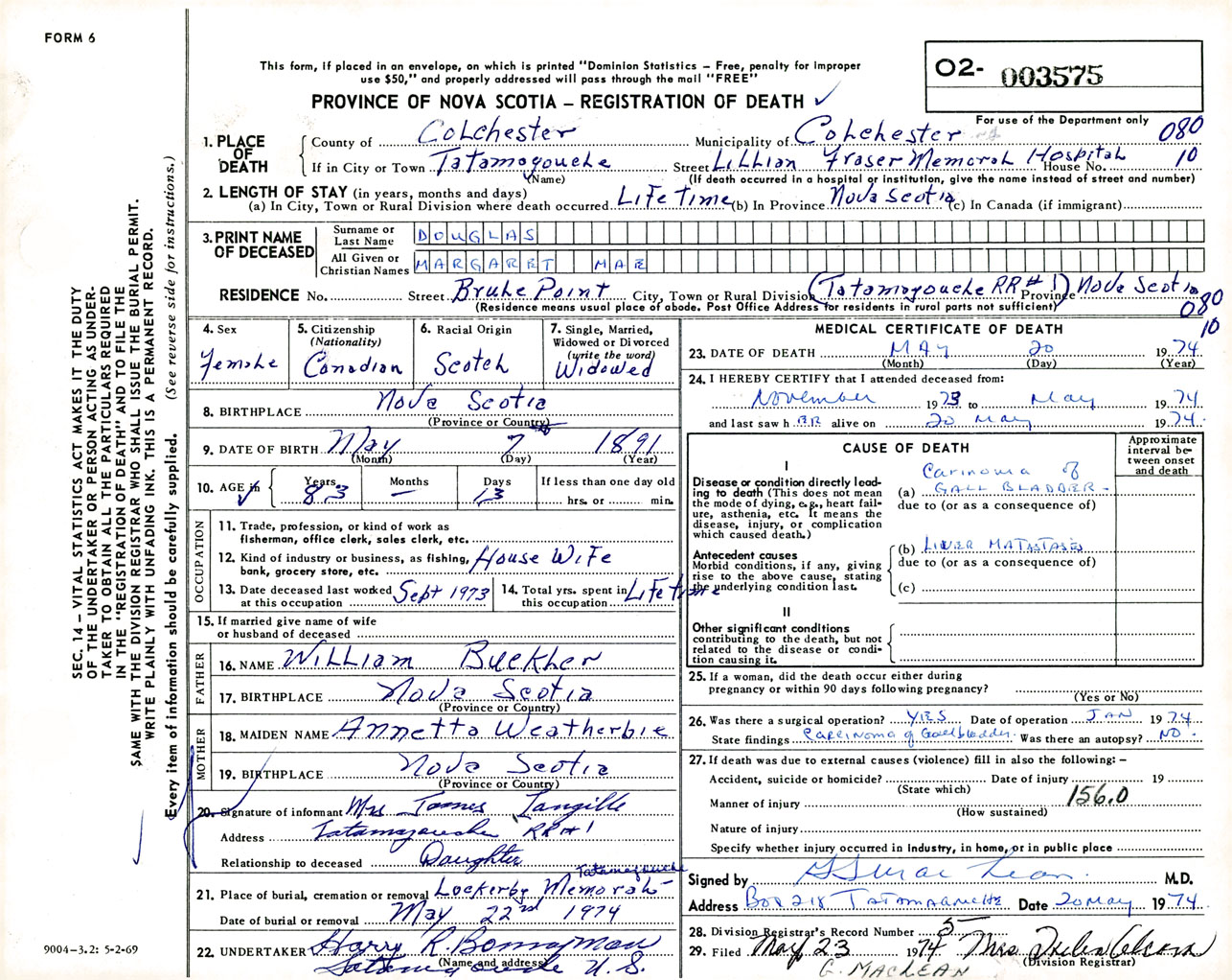 Female Death Registration: Year: 1974 number: 3575