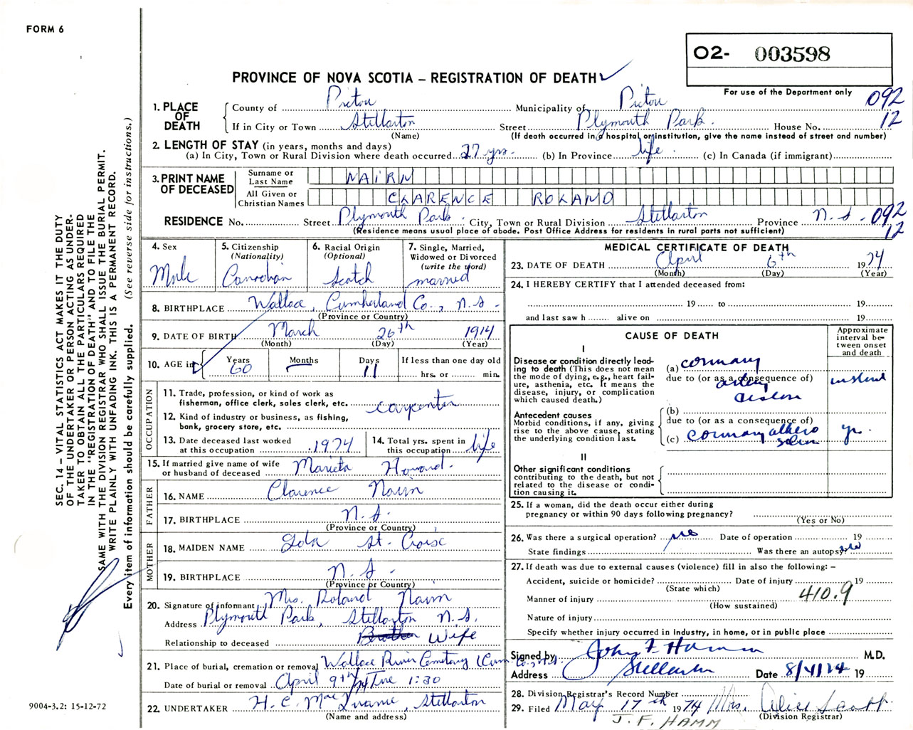 Male Death Registration: Year: 1974 number: 3598