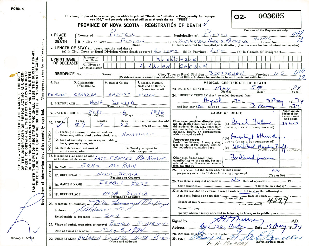 Female Death Registration: Year: 1974 number: 3605