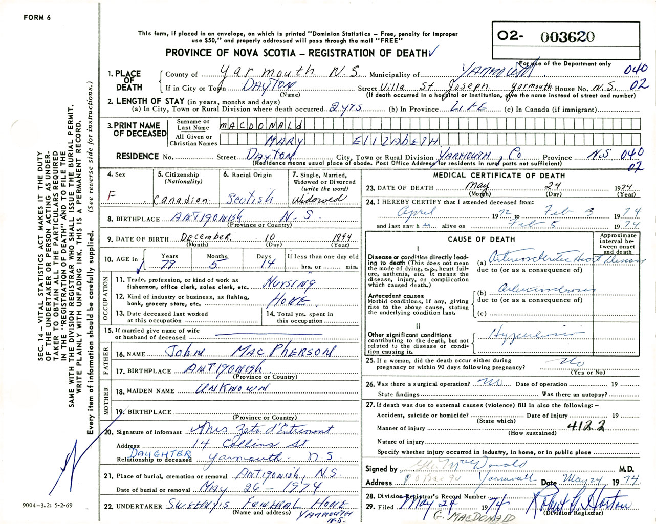 Female Death Registration: Year: 1974 number: 3620