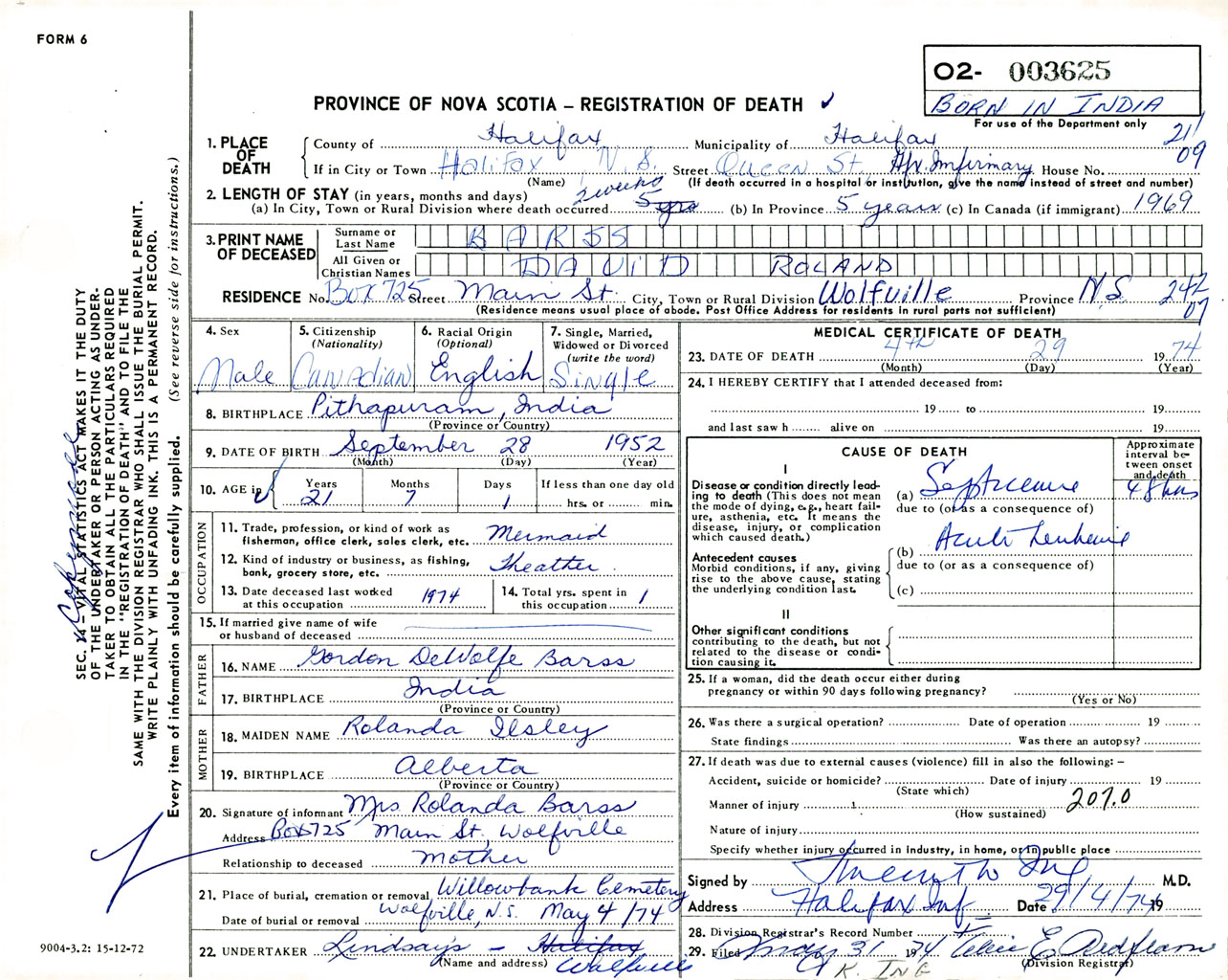 Male Death Registration: Year: 1974 number: 3625